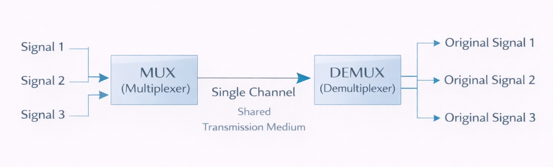 - At the receiver, a demultiplexer (DEMUX) separates the original signals.