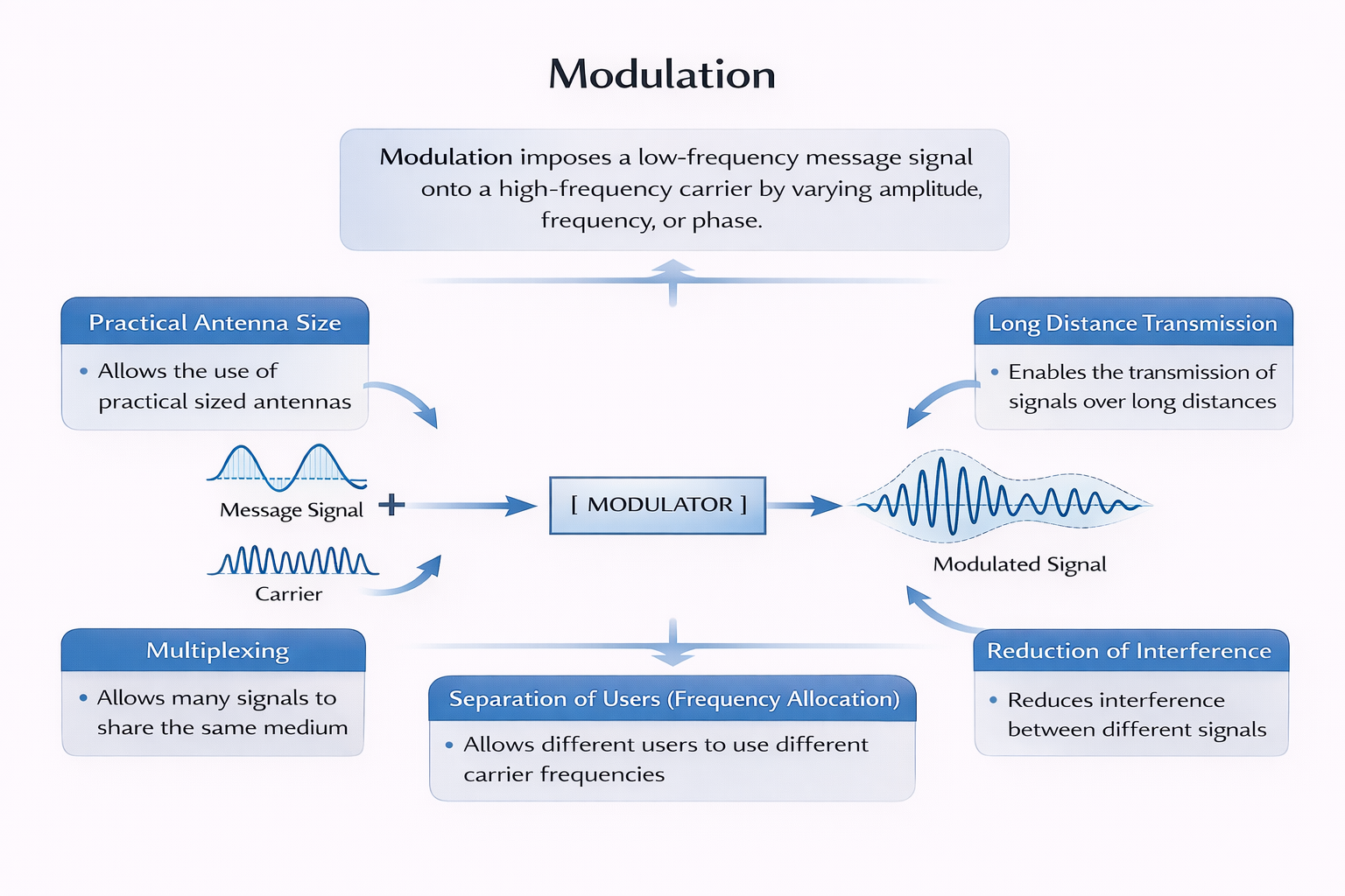Modulation is the process of imposing a low-frequency information signal (message) onto a high-frequency carrier signal by varying one of the carrier’s parameters: amplitude, frequency, or phase.