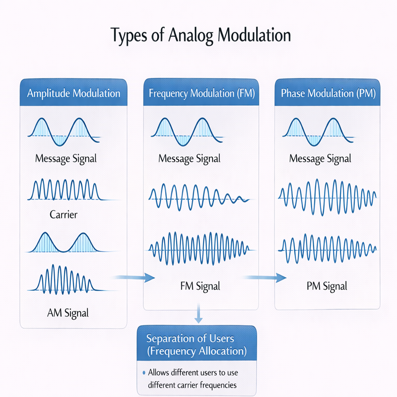 In communication systems, the message signal (such as speech or music) is usually a low-frequency signal. Such low-frequency signals cannot be transmitted efficiently over long distances using antennas, and they also suffer more from noise and interference. To solve this problem, we use a high-frequency signal called a carrier.
