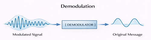 At the receiver, the transmitted signal is no longer the original message; it is a modulated signal. To recover the original information, the reverse process of modulation is performed.