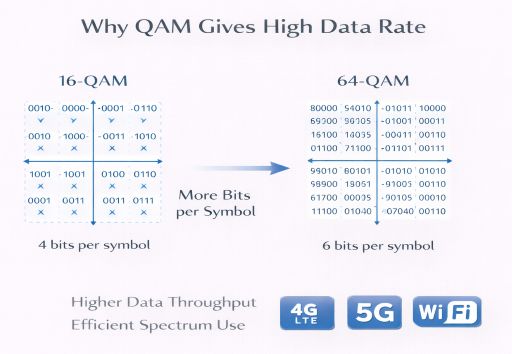 By using higher-order QAM schemes like 64-QAM, 256-QAM, or even 1024-QAM, these systems can increase data throughput without increasing bandwidth. Therefore, QAM plays a key role in achieving the high-speed performance of modern wireless networks.