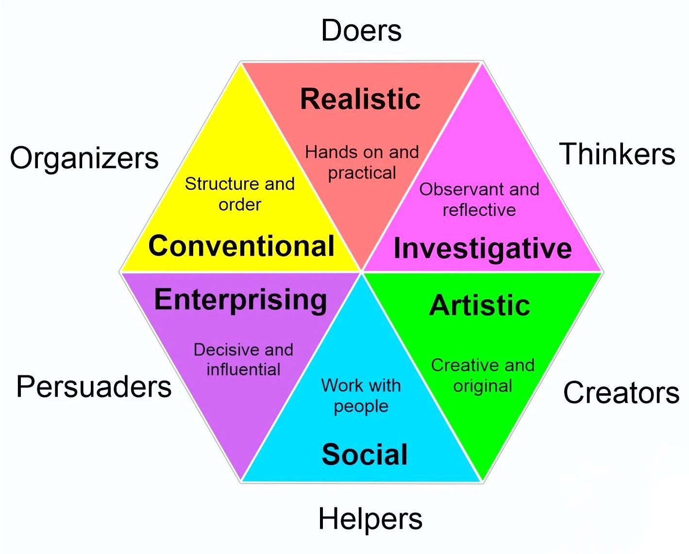 Realistic individuals are likely to work with plants, animals, machines, or tools. They avoid social activities such as teaching or informing others and prefer to learn by doing in a practical, task-oriented setting.